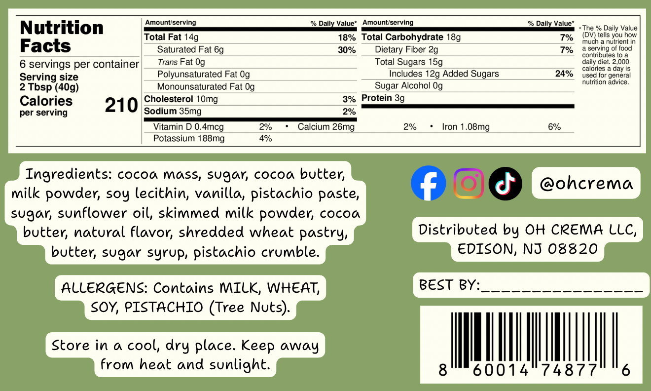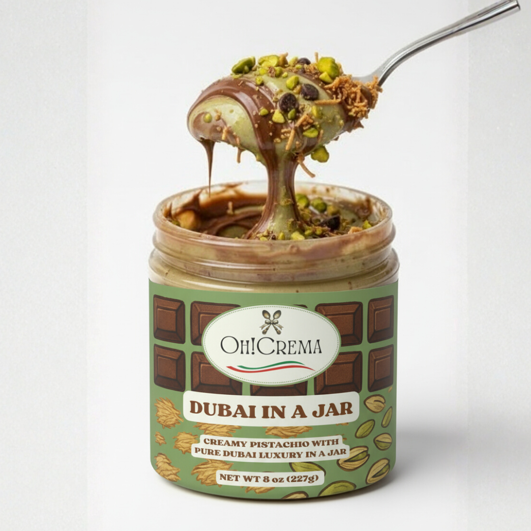 Oh! Crema’s Dubai in a Jar blends creamy pistachio, crunchy golden kadayıf, and rich Belgian chocolate into a silky, decadent spread inspired by Dubai’s world-famous desserts.