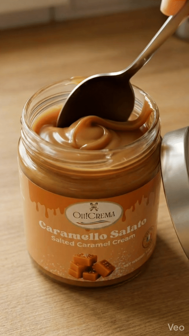 Oh! Crema Caramello Salato is a silky salted caramel cream spread—rich, glossy, and perfectly balanced with a touch of sea salt for that gourmet finish.